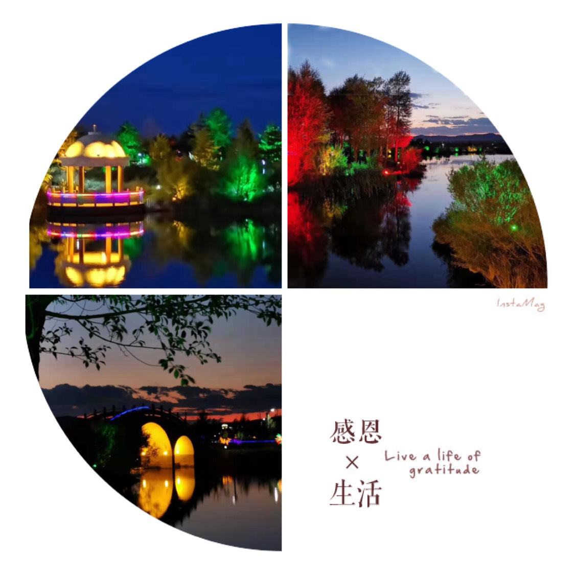 晚上的濕地公園,同白天的大草原是截然不同的風(fēng)景,夕陽落下,平靜的水面上亮起盞盞彩燈,這是在內(nèi)陸的大都市不曾看過的景色。